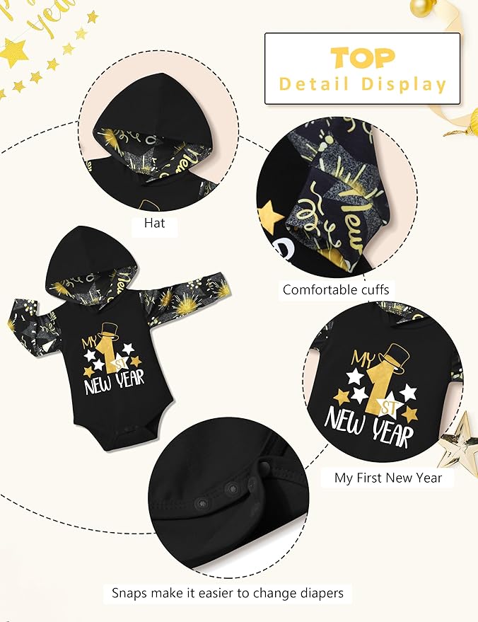 - Novel design: My first New Year baby boy outfit cute words express the love of mom and dad. Black fireworks hoodie, fireworks Happy New Year print pants create a more charming impression. The buttons on the lower part of the hoodie are designed with convenient snaps for easy diaper changes
