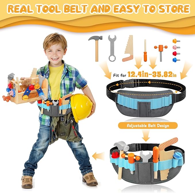 - Adjustable Tool Belt:It is designed to make your child feel like a true professional. With 7 handy storage pockets, perfect for keeping tools and small parts organized and within easy reach. Allowing for a custom fit from 19 to 28 inches, offering a comfortable, custom fit every time. From pretend play to real-life learning moments, this tool belt is built to handle it all, inspiring confidence and creativity along the way
