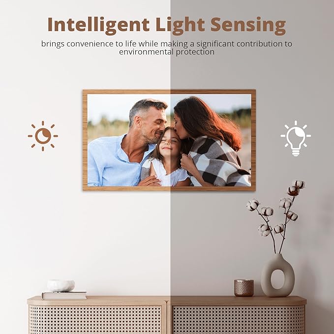 - AUTO-ROTATE & BRIGHTNESS ADJUSTMENT - The digital picture frame has the ability to automatically switch between portrait and landscape orientations. It can be placed on a table or hung on a wall. Additionally, the screen brightness can be automatically adjusted based on changes in ambient light.(Remote control,Not TouchScreen)