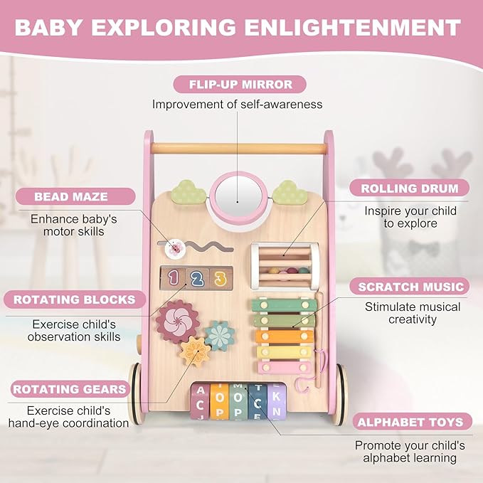 - đăEngaging Multi-Activity CenterăSpark curiosity with this baby walker push toy! Doubling as a vibrant activity walker, it features a xylophone, mirror, shape puzzles, bead maze, and spinning gears. As a premier walking toy for infants 6-12 months, its rainbow colors stimulate senses while developing motor skills. The ultimate activity walker for baby 6-12 months and engaging walker toy!