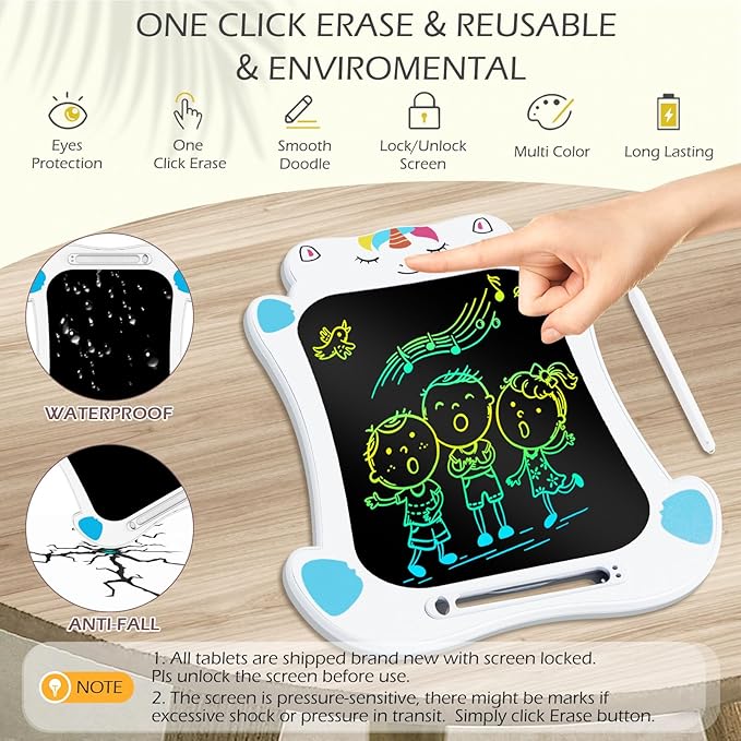 - No Chalk Dust, No Harmful Chemicals, No Mess Colorful Drawing Tablet --- Mess free coloring for toddlers kids. The drawing board screen is pressure-sensitive,draw simply with a stylus or similar hard object. Easy to draw or write down your great ideas on the screen. Great birthday gifts | children's day gifts | car activities / travel toys| Valentines day gifts for kids | Christmas gifts presents toys for toddlers kids 3 4 5 6 7 8 year old girls and boys.