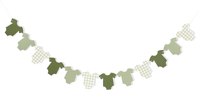 - Green Bodysuit Banner: This Adorable Baby Bunting Is Perfect For Baby Shower Decorations, Christenings, Or Simply Welcoming A Newborn Home. The Bunting Is In The Style Of A Baby Undershirt, And The Baby Shower Decor Has A Green, Plaid Light Green Combination Banner
