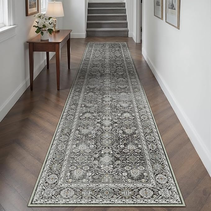 Black Runner Rug 2x12 Vintage Area Carpet Hallway Long Indoor Kitchen Washable Living Room Low Pile Traditional Distressed Retro Accent Throw Rug Non Slip Laundry Bathroom Office Dining Room