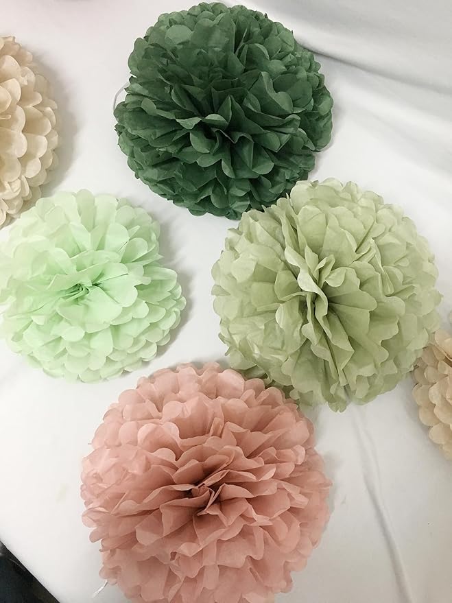 Tissue Paper Pom Poms Kit Paper Flowers 12pieces for Gender Baby Shower Wedding Bridal Bachelorette Birthday Party Decorations (Boho Green + Dusty Pink)