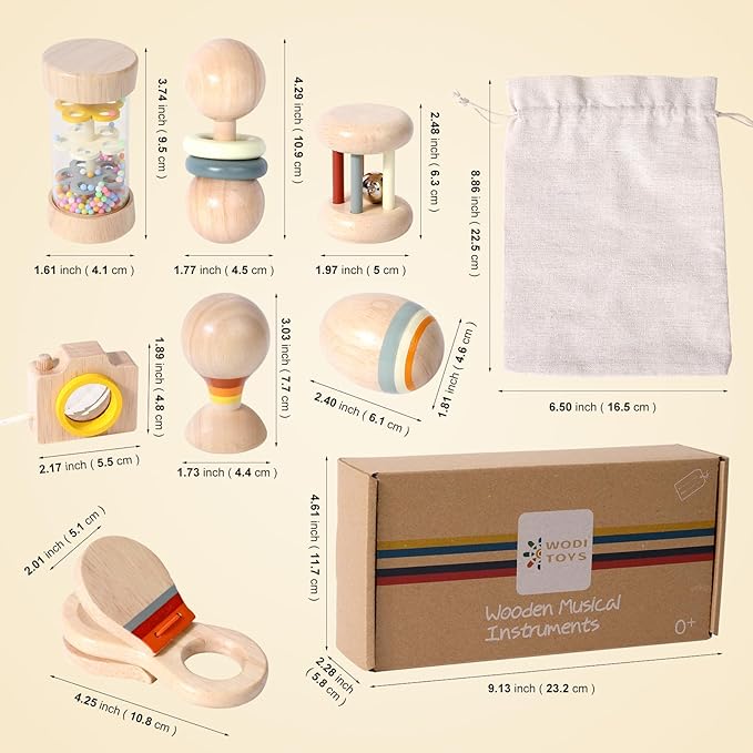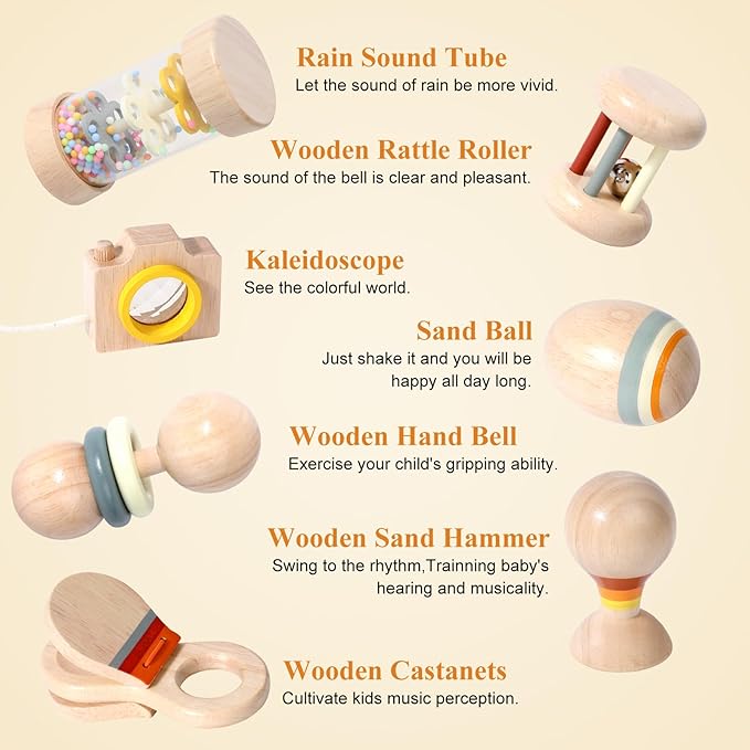 - Montessori Wooden Musical Instruments Toys Set - 7pcs toddler preschool educational musical toys set for baby boys and girls include 1 rain sound tube, 1 sand hammer, 1 kaleidoscope, 1 rattle roller, 1 sand ball,1 hand bell and 1 castanets; They are designed to stimulate your baby’s senses and curiosity, and perfect preschool education musical toys for your kids, and are a way to introduce kids to music