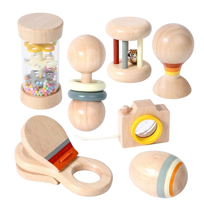 - Develop Babies' Early Skills - The sound of wooden rattles are designed to emit sound when shaken.They will attract babies' attention to find the origin of the sound and enjoy the pleasant sound they make. Their fingers can easy grasp and they will love to shake these wooden toys. ( Please use the wooden baby toys under parents' supervision and regularly check the toys, don't use them if they appear "cracked")