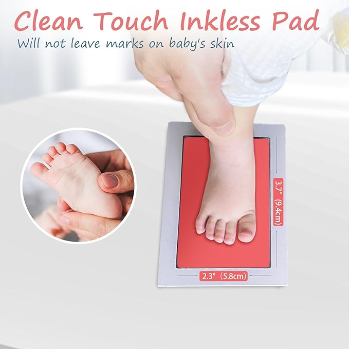 • [Perfect Gifts]: This baby ink hand and footprint kit measures 5.0"x3.2" and has an ink window of 3.7"x2.3".Ideal for newborn baby hand and footprint, use the baby inkless ink pad, you will have personalized baby footprint keepsake, it's not only for baby shower gifts but also for pet birthday gifts.