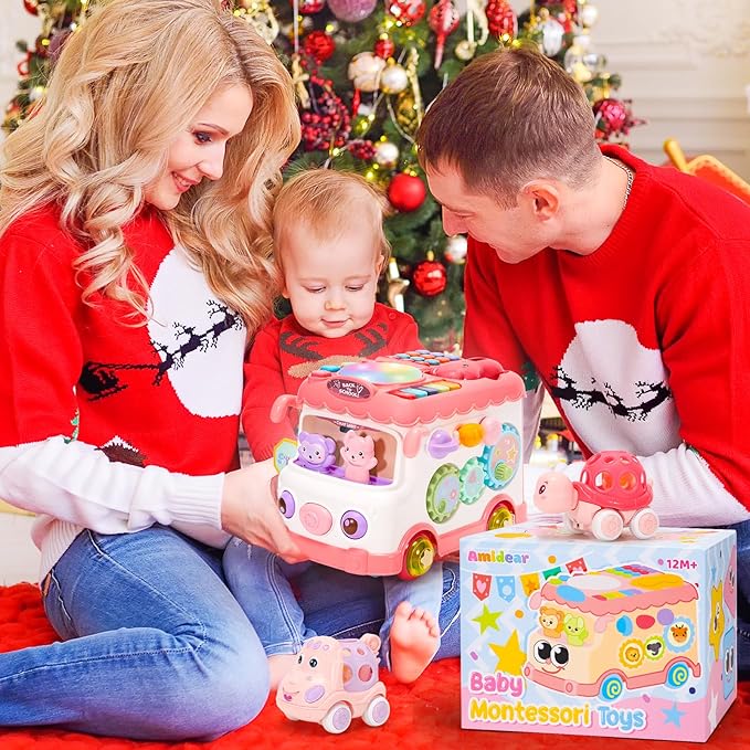 Baby Gift for 1-2 Year Old Girl, 10-in-1 Montessori Toys Bus for Baby 6-12-18 Months+, Educational Musical Sensory Learning Toddler Toys Age 1-2, First Christmas and Birthday Gifts Pink
