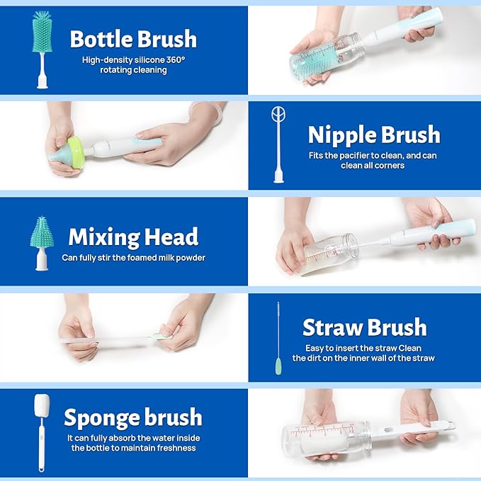 - 【Safe Material & Waterproof】 The bottle cleaner brush set is made of liquid silicone and food grade BPA free silicone +ABS + PP + PC , to make sure it's safe for in a dishwasher, boil water or steamer. IPX7 waterproof rating, make the baby bottle washer easy to clean and long lasting.