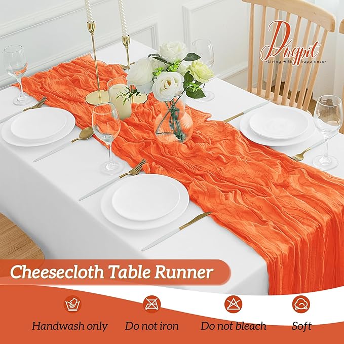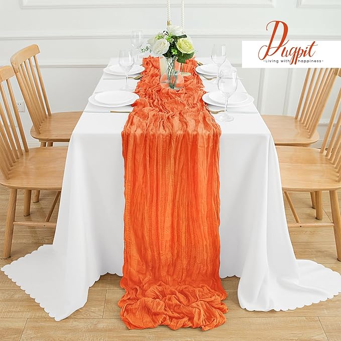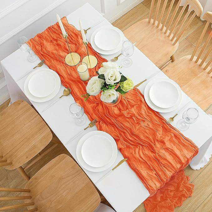 - High Quality Material: Our orange table runner is made of 100% natural cheesecloth fabric, with beautiful pleats, delicate and elegant, full of beauty. Soft to the touch, durable and reusable. This gauze table runners is translucent and naturally draped, elegantly hanging over your banquet table