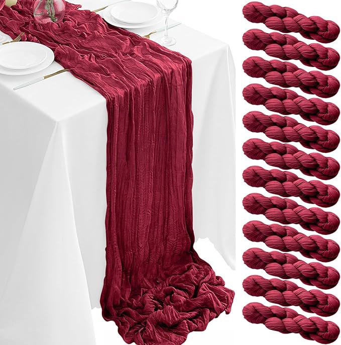 - Package Included:You will get 12 pack of burgundy table runners, perfect for wedding banquets and various parties and fall table decor, enough to meet your daily use and replacement needs. Each cheese cloth table runner measures approximately 35 x 120 inches/90 x 300 cm, long enough to be used individually on rectangular and round tables, or pieced together for long tables. No matter how it is used, this burgundy table runner can be placed perfectly and elegantly on the table or hung on the floor, adding a romantic atmosphere to your occasion