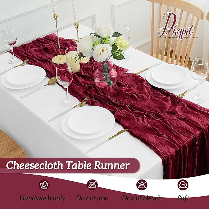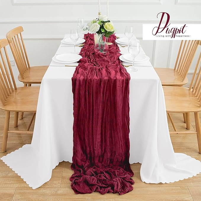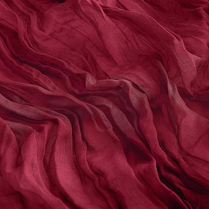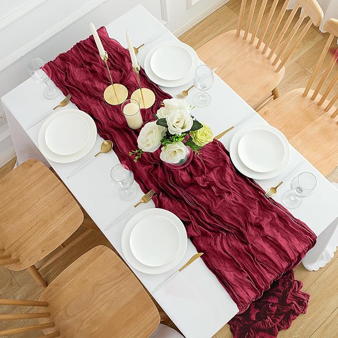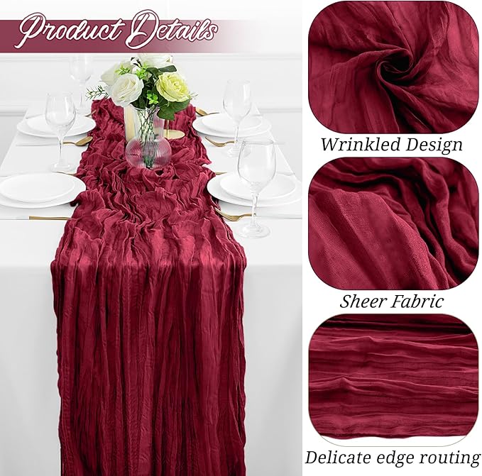 - High Quality Material: Our burgundy cheesecloth table runner is made of 100% natural cheesecloth fabric, with beautiful pleats, delicate and elegant, full of beauty. Soft to the touch, durable and reusable. This gauze table runners is translucent and naturally draped, elegantly hanging over your banquet table
