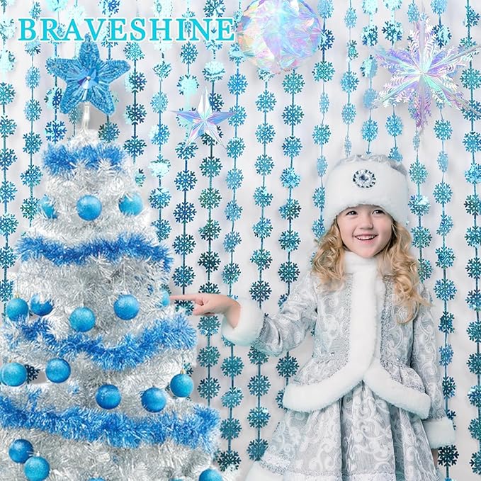 BRAVESHINE Blue Party Snowflake Backdrop - 2 Pack Hanging Foil Fringe Snow Flakes Party Streamers Curtain for Christmas Winter-Themed Frozen Birthday Baby Shower Holiday New Year Party Decorations