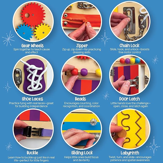 - Builds Skills Through Play - This toddler busy board is thoughtfully designed as a Montessori play board that helps develop fine motor skills, sensory awareness, and early independence. With zippers, latches, and a shoelace panel, this sensory board builds real-life coordination through fun hands-on activities.