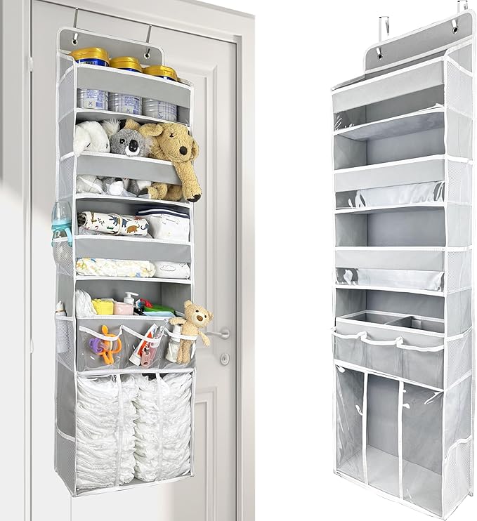 - CREATIVE PATENT DESIGN: This is not only a door hanging storage organizer, but also with an additional movable baby diaper storage caddy . The storage caddy has built-in partitions that can be divided into areas for storing daily necessities,such as bath care, clothing, diapers, baby moisturizers, wet wipes, breast pumps, and accessories. There are three PVC pockets on the outside of the nursery storage caddy for storing small items such as nail clippers, pacifiers, small toys, etc. The storage caddy can be easily removed from the hanging organizer and placed next to the bed for convenient use during late night feeding.