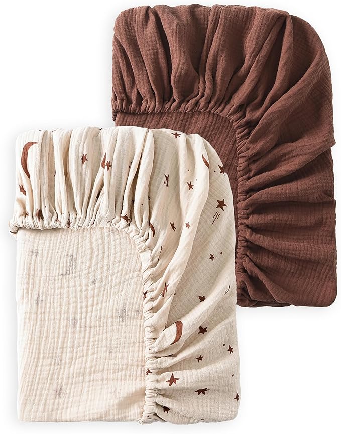 Baby Crib Sheets 2 PCS, 100% Organic Cotton Crib Sheet for Standard Crib Mattress(52”x 28”), Fitted and Soft Breathable Muslin Crib Mattress Sheet for Girl and Boy (Star, Brown)