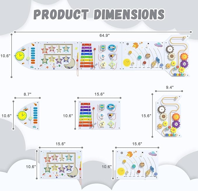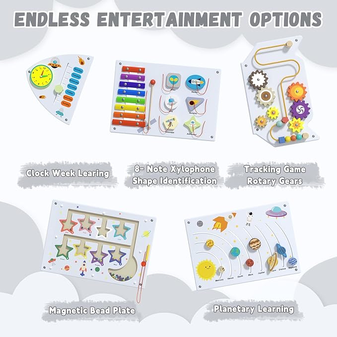 - MONTESSORI WALL SENSORY BOARD: Follows Montessori principles to help kids develop motor skills, hand-eye coordination, language, recognition, spatial understanding, counting, and musical awareness, enhancing social, cognitive, and emotional skills