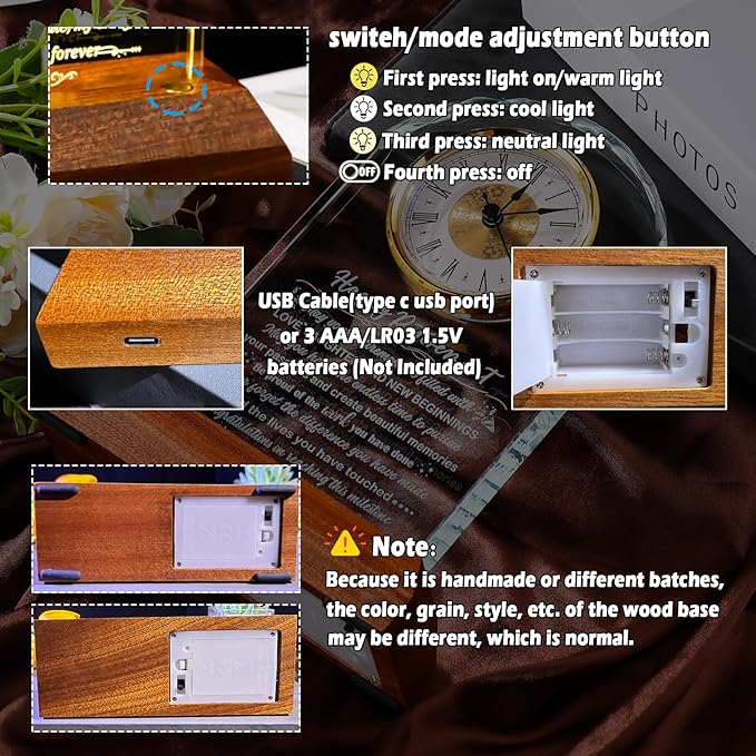 - Elegant Design - If you are looking for a unique gift for a retired colleague, boss, or other retiring friend, our glass clock is a special choice. This quartz clock is elegantly designed and comes with premium wooden base. Soft lighting adds warmth to any space and is an ideal gift that combines functionality and fashion. It is a constant reminder of their value and contributions to society and wishes them a new chapter in their lives, making it a cherished gift