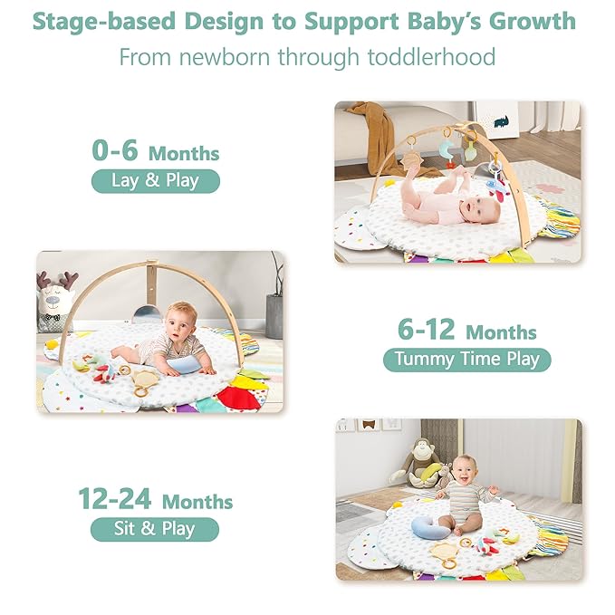 - 【All-around Early Development】This baby gym includes detachable toys such as Moon Teether, Self-Discovery Mirror, Airplane Rattle, and Leaf Ring, all tailored for stage-based learning. Whether your baby is lifting their head for tummy time or playing hide-and-seek as a toddler, this gym provides endless fun for a whole year of developmental play.