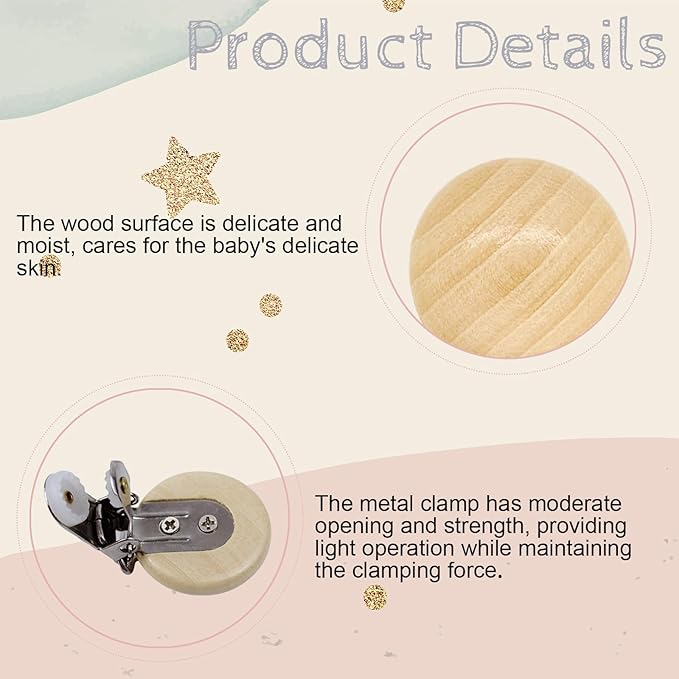 - Reliable Material: pacifier clips are made of wood and metal, odorless and reliable, safe material for your baby to use; Wood chips and clips can be connected by 2 screws, so it's more secure