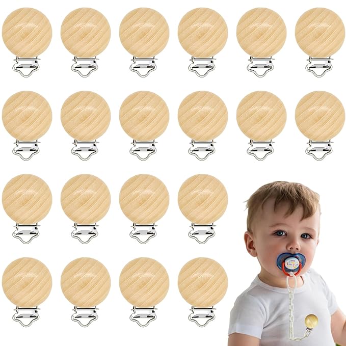 20 Pieces Wood Pacifier Clips Teething Grasping Toy Suspender Clips Natural Beech Wood Pacifier Clip Holder Charm DIY Pacifier Clips Chain Accessories