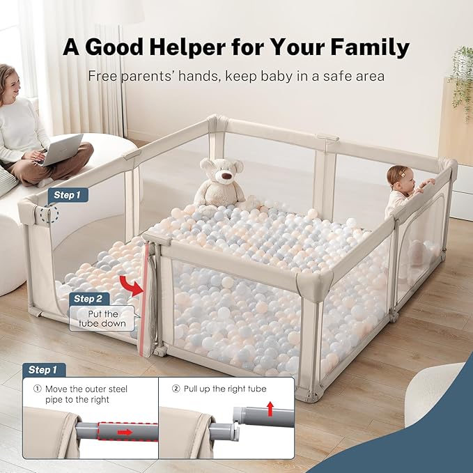 - [Easy To Assemble And Fold Up]This is one of easiest playpen to set up for its One-Piece Locking Joints, no need to figure out a variety of pieces of a toddler playpen, you only need to open it, pull up and put down the locking mechanisms. Just push a few buttons to unlock the enclosure and you can fold this large playpen for space saving or moving it. In its folded state, this baby fence has good compactness and portability, easy to carry and move, itâs a great travel companion with your baby.