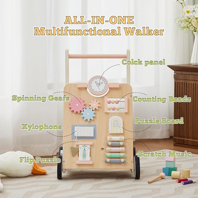 - 【Multi-Functional Push Walker】This wood baby walker push toy has a vibrant interactive panel that combines 9 classic baby favorite features: rotating mirrow, spinning gears, counting beads, puzzle board, xylophone, flip puzzle, scratch music, shape matching, tracking game, all kinds of activities that stimulate baby's senses