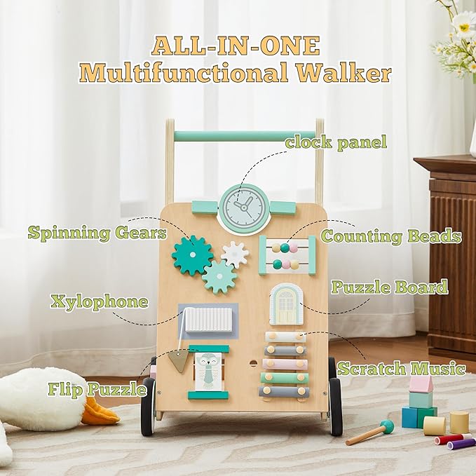 - 【Multi-Functional Push Walker】This wood baby walker push toy has a vibrant interactive panel that combines 9 classic baby favorite features: rotating mirrow, spinning gears, counting beads, puzzle board, xylophone, flip puzzle, scratch music, shape matching, tracking game, all kinds of activities that stimulate baby's senses