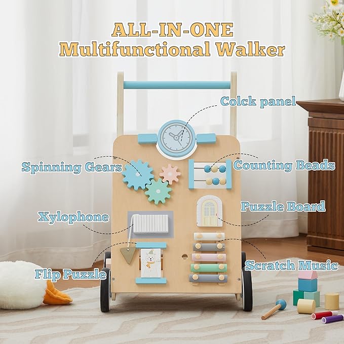- 【Multi-Functional Push Walker】This wood baby walker push toy has a vibrant interactive panel that combines 9 classic baby favorite features: rotating mirrow, spinning gears, counting beads, puzzle board, xylophone, flip puzzle, scratch music, shape matching, tracking game, all kinds of activities that stimulate baby's senses