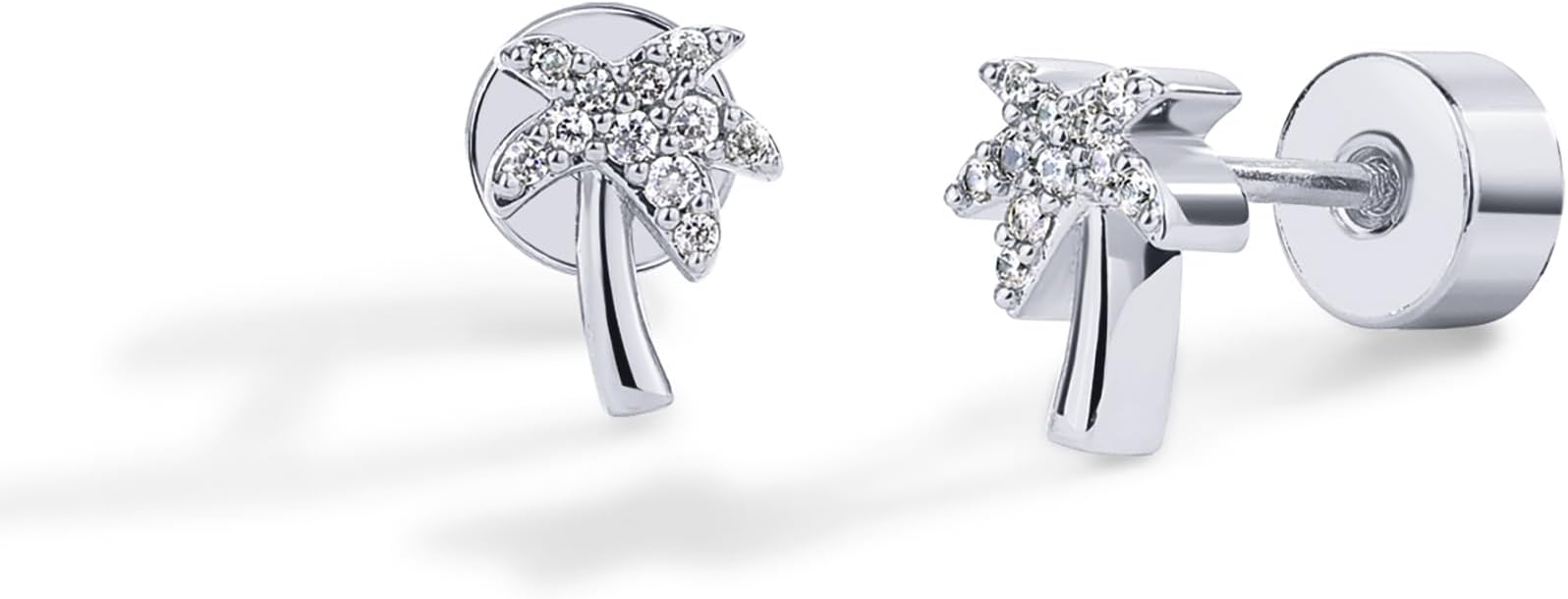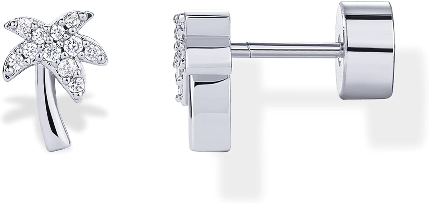 - HIGHLIGHTS: Add a tropical twist to your look with these rhodium-plated pavoi flatback earrings for women. These screwback stud earrings feature a palm tree shape, that measure 7mm x 5mm with 1mm premium cubic zirconia stones. A touch of emoji-inspired jewelry perfect for a fun and stylish vibe.