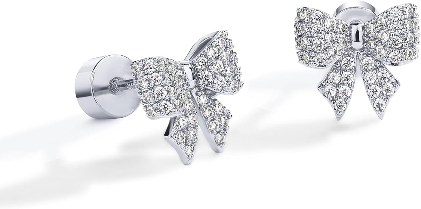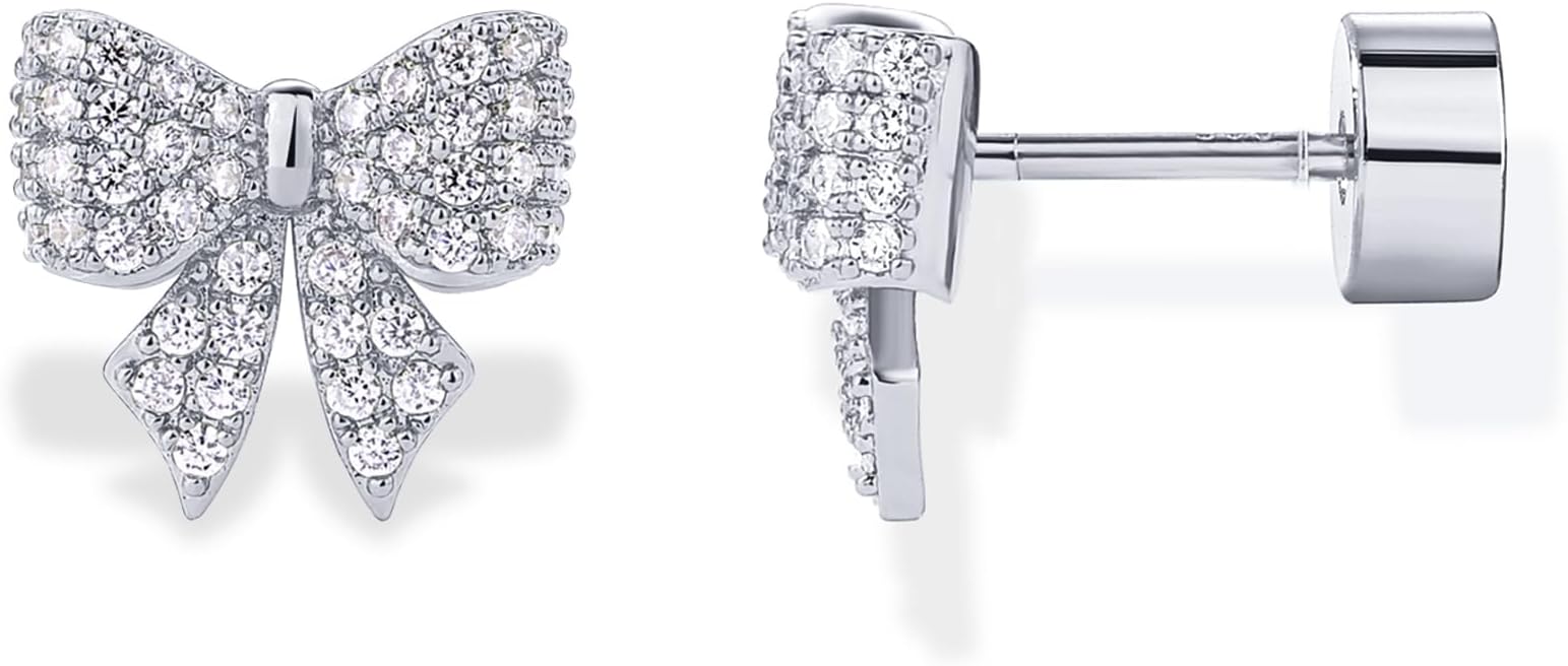 - HIGHLIGHTS: Elevate your style with these rhodium-plated pavoi flatback earrings for women. Featuring a bow design, each earring measures 9mm x 10mm and sparkles with 1mm premium cubic zirconia stones. A coquette choice for emoji-inspired jewelry with timeless charm.