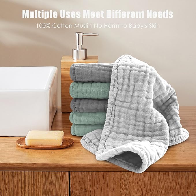 - π LUXURIOUSLY SOFT MUSLIN COTTON SET: Elevate your baby's bath time with our set of 12 washcloths, meticulously crafted from 100% Muslin Cotton. Designed for newborns and infants, these washcloths are ultra-absorbent and perfect for gentle cleansing.