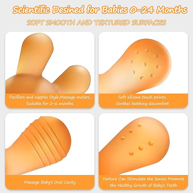- 【Relieve Sore Gums & Develop Good Oral Hygiene Habits】: while our baby go through weaning and teething phase, the Baby Teether Toys have different protruding textures and bumpy massage particles, which can massage the baby’s gums, and reduce fussiness & discomfort. Baby teething toys can prevent babies from biting or sucking their fingers. It helps protect children's oral hygiene.