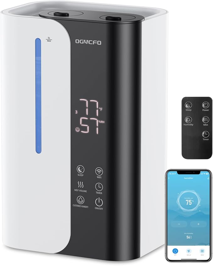 - ๐๐ฆ๐๐ซ๐ญ ๐๐จ๐ง๐ญ๐ซ๐จ๐ฅ ๐ฐ๐ข๐ญ๐ก ๐๐ฎ๐ฒ๐ ๐๐ฉ๐ฉ: Connect this large humidifiers for home to Wi-Fi and control it remotely through the Tuya app. Turn it on/off, adjust humidity levels, modify mist output, set a 24-hour countdown, and more, all from your phone