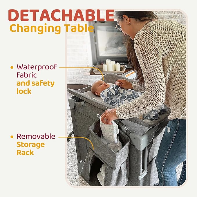 - Seamless Conversion: Effortlessly transform our 5-in-1 bassinet from a soothing cradle into a secure crib, a practical diaper-changing station, or an engaging play area. With dual height settings and a convenient storage pocket, this versatile design adapts to different needs with ease