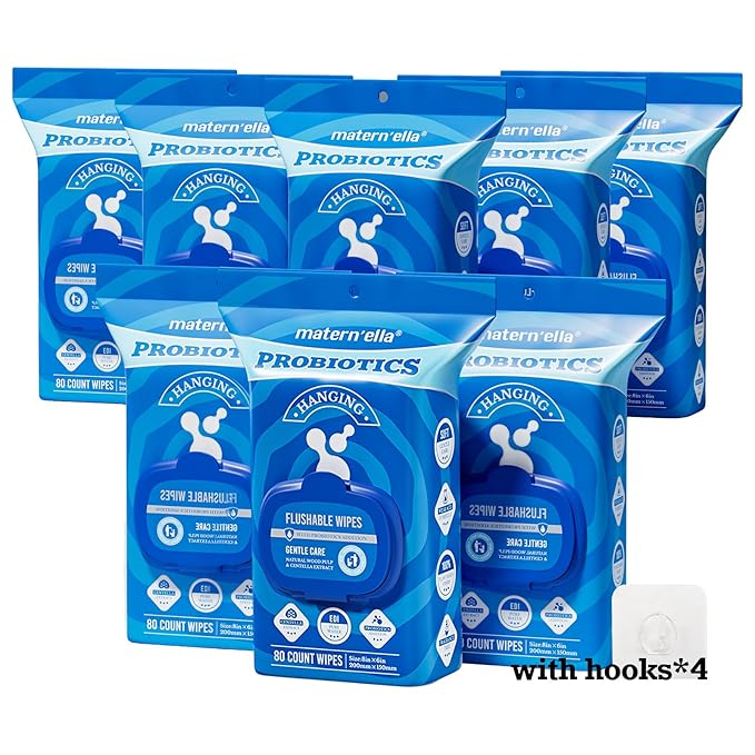 matern'ella Hanging Flushable Wipes Unscented Extra Large Corner-Connected Wet Wipes Adult Plant Based Fibers with Probiotics Alcohol Free Sewer Safe Butt Wipes Travel 8 Packs 640 Wipes