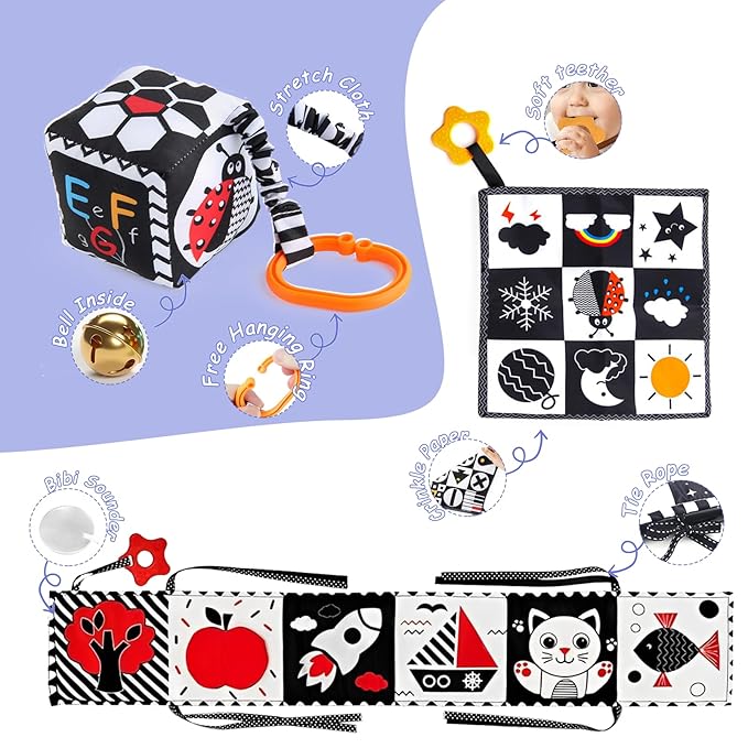 - Parents Assured & High-quality Baby Toys: Our black and white baby toys are made of high-quality fabrics and pure cotton. The material is skin-friendly, soft and comfortable, non-toxic and odorless, and doesn't contain BPA. The strong stitching makes it durable and washable. What's more, it's friendly to the baby's skin, safe to put in the mouth, and safe for babies who are teething.