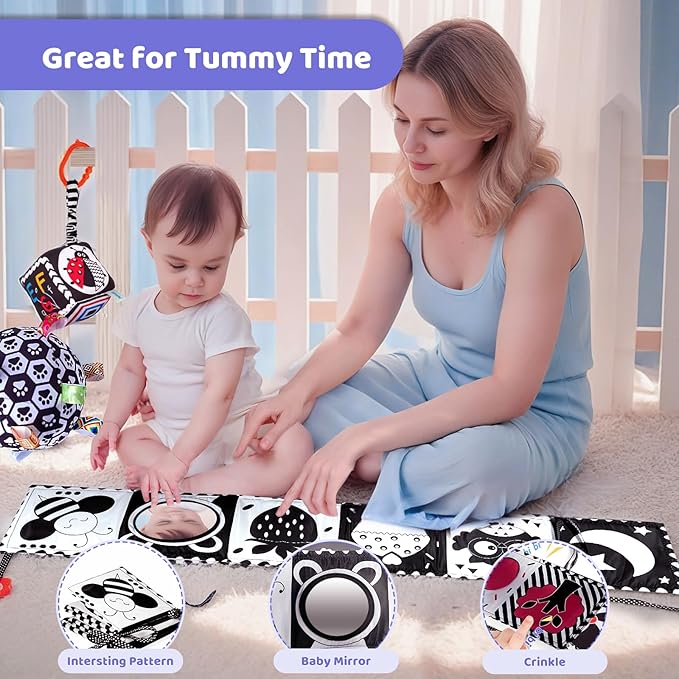- Baby Gifts for Boys and Girls: This Montessori toy is the best blessing and gift for parents to newborns. Let the black and white baby toys accompany the baby to grow up healthily. Great baby toys, baby soft sensory book with mirror, baby sensory toys, baby rattle toys, tummy time toys. If you have any questions, please feel free to contact us. We are happy to provide you with a perfect shopping experience.