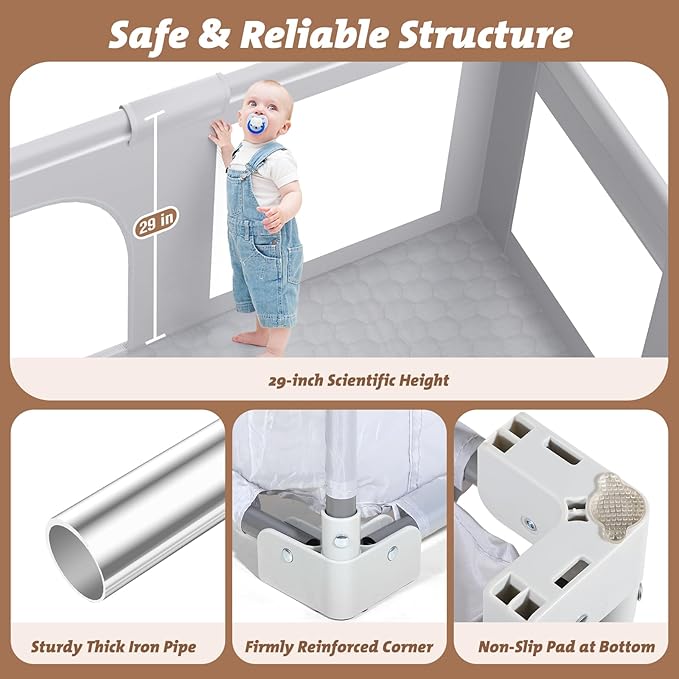 - Safe Structure for Active Play: Designed for active kids, our baby playpen features sturdy iron pipes wrapped in wear-resistant Oxford cloth and a cushioned interior that withstands vigorous play and prevents bumps, while the base is non-slip for safety