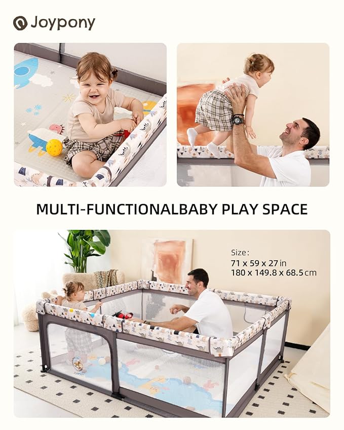 - 👶Playpen For Babies and Toddlers👶 Joypony's expansive 71"x59"x27" baby playpen provides enough room for four or five children to play together, and even parents can join in the fun. Joypony baby playpen is meticulously designed, combining safety, convenience, and aesthetics, creating a safe playground for children to explore while allowing parents to free up their hands and enjoy more leisure time.