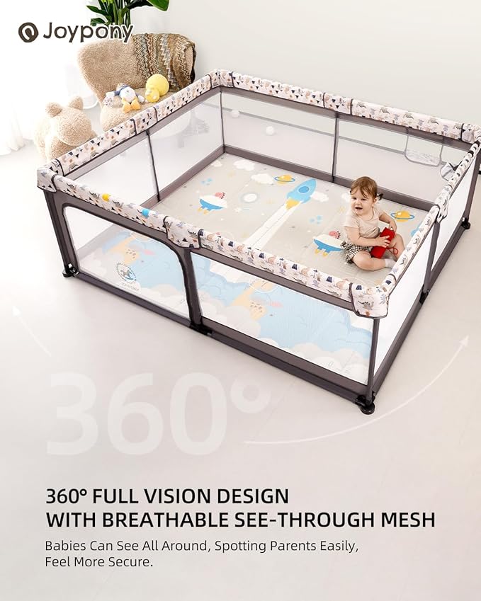 - 🧸Easy to install🧸Assembly is quick and hassle-free with Joypony baby play yard user-friendly instruction manual and video, allowing you to set up the playpen in minutes. The lightweight and foldable design make it convenient to transport and store when not in use.Enjoy a 360° view of your child's playtime with Joypony baby play pen breathable mesh design. The external gate zipper design only opens from the outside, reinforcing child safety.