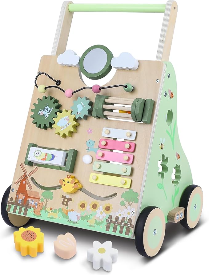 - 【MULTIFUNCTIONAL FUN】 - The baby push walker comes with a xylophone, rotating mirror, flower shape puzzles, colorful beads, gears and a variety of other engaging learning toys in a colorful farm style print, keeps baby entertained and enhances color perception.