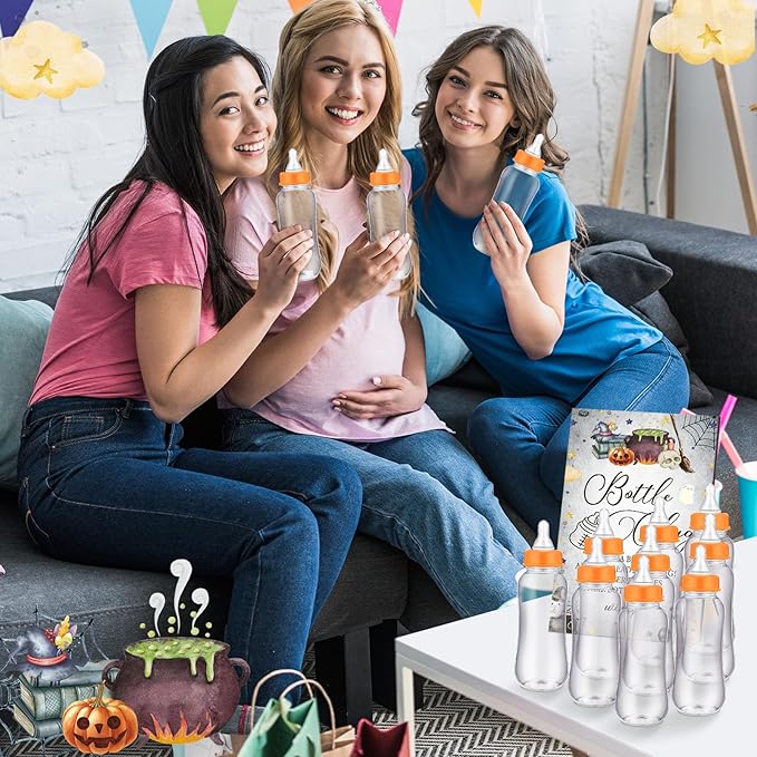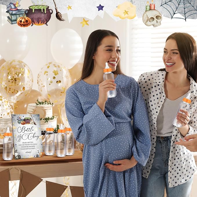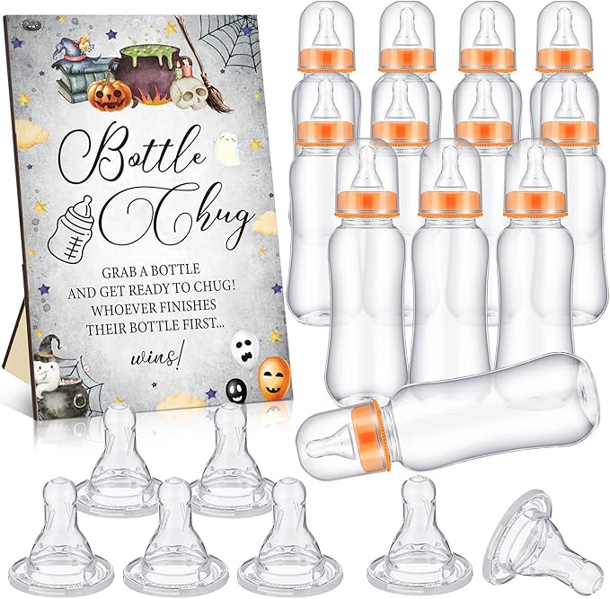 TrelaCo Halloween Cool Baby Shower Games Bottle Chug Sign Wooden Halloween Boo Theme Baby Gift Sets Gender Reveal Party Favors and 12 Pcs Baby Bottle Shower Favor Baby Bottles for Baby Shower