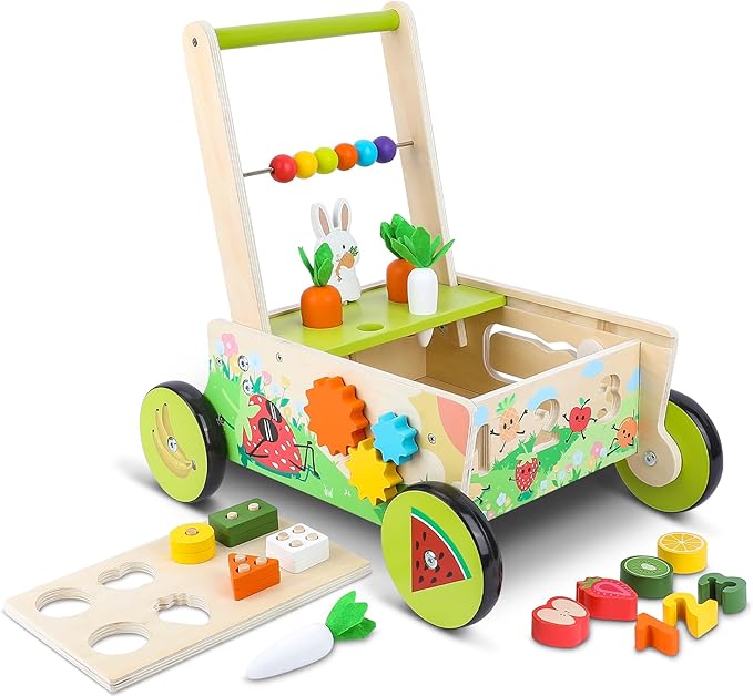 - 【MULTIFUNCTIONAL FUN】 The baby push walker comes with a cute rabbit, carrots, fruit shape puzzles, colorful beads, gears and a variety of other engaging learning toys in a colorful fruit style print, keeps baby entertained and enhances color perception.