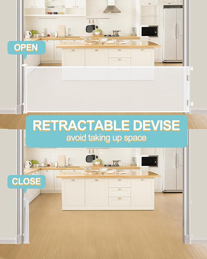 - [Retractable Design] The retractable baby gate is easy to use in high traffic areas, and the mesh baby gate can be completely retracted when not in use without taking up a large space.