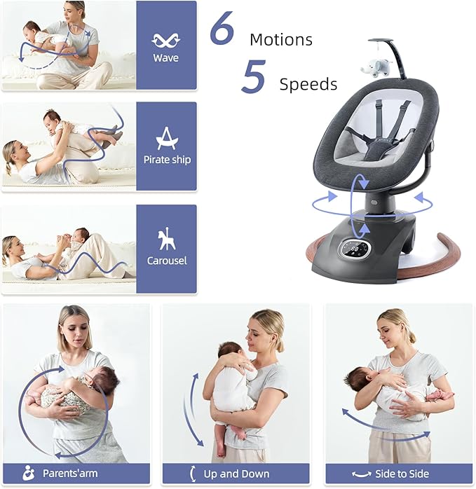 - Soothe and Entertain Your Baby: Mix and match 6 parent-inspired motions—3 to soothe & 3 to play. VaVaSoo swing for baby includes side-to-side, bounce, figure 8, M, O, and ~ shapes. With 5 speeds and 90°rotation, it gives your arms a much-needed break.