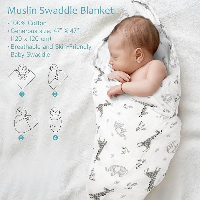- 【100% COTTON SERIES BABY GIFTS】Our soft, breathable muslin cotton swaddle (47" x 47") gently wraps your baby in a cozy hug—just like Mom’s arms. It also doubles as a nursing cover, burp cloth, tummy time blanket, or storage blanket, making it a must-have for any newborn! The 'You Bet Giraffe I’m Cute' onesie adds a playful touch, making your little one the coolest baby around. Pair it with the adorable elephant socks for extra fun and charm! This makes a very practical baby shower gifts!