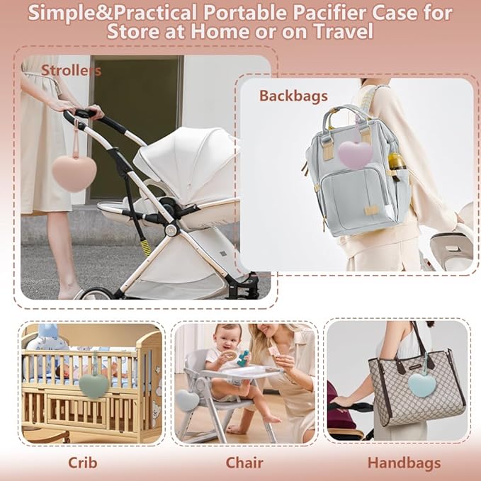 - 【Easy to Clean and Carry】:Our pacifier holder features a easy-clean surface that keeps your baby's pacifiers clean no matter where you go. Even if it takes a tumble, your pacifier will remain unsoiled. With a built-in hanging strap, it attaches effortlessly to diaper bags, handbags, strollers, and car seats, putting your pacifiers within reach.Letting your baby use the pacifier or soother anytime and anywhere