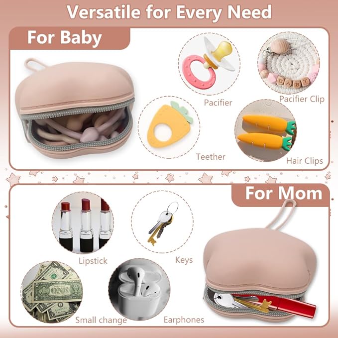 - 【Wide Application,Easy to Carry】: Silicone pacifier holder is big enough to store up to two pacifiers, a pacifier chain, and teething toys; and once baby has grown up, Moms can use it for small essentials like lip balm, hair ties, or earbuds. Keep your baby's gear organized while on the move. With a built-in hanging strap, it attaches effortlessly to diaper bags, handbags, strollers, and car seats, putting your pacifiers within reach.