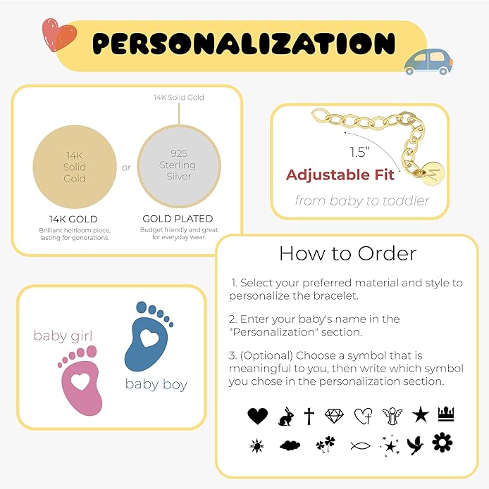 - Personalized Baby Name Bracelet: Create a one-of-a-kind keepsake for your little one with this Custom Baby Bracelet with Ladybug, Cross, Car, Footprint, Rainbow or Heart Symbol baby name bracelet, perfect for celebrating your baby's unique identity.